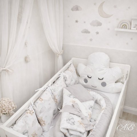 Andy Brandy komplet oblak sastoji se od ogradice za krevetić 60×120 cm koju čini ukrasni jastučić oblak na uzglavlju sa četiri bočna jastučića, gnijezda za bebe i jastuka za bebe s mašnom.