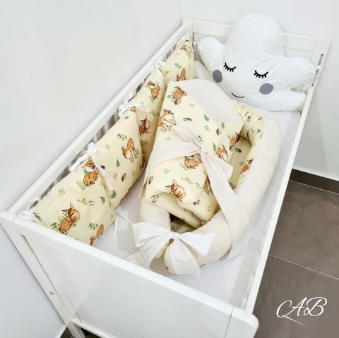 Andy Brandy komplet oblak sastoji se od ogradice za krevetić 60×120 cm koju čini ukrasni jastučić oblak na uzglavlju sa četiri bočna jastučića, gnijezda za bebe i jastuka za bebe s mašnom.