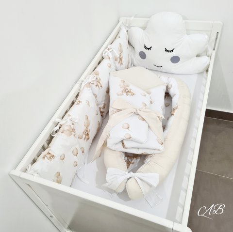 Andy Brandy komplet oblak sastoji se od ogradice za krevetić 60×120 cm koju čini ukrasni jastučić oblak na uzglavlju sa četiri bočna jastučića, gnijezda za bebe i jastuka za bebe s mašnom.