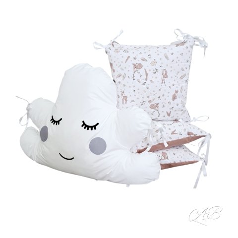 Andy Brandy ogradica oblačko sastoji se od ukrasnog jastuka oblaka na uzglavlju koji će biti dobar i vjeran prijatelj u snu Vašoj bebi i četiri bočna jastučića. Ručno je izađena je od najfinijih pamučnih tkanina s OEKO-TEX 100 class I certifikatom. Punjena je antialergijskim silikoniziranim kuglicama. Svakom krevetiću daje poseban šarm.
